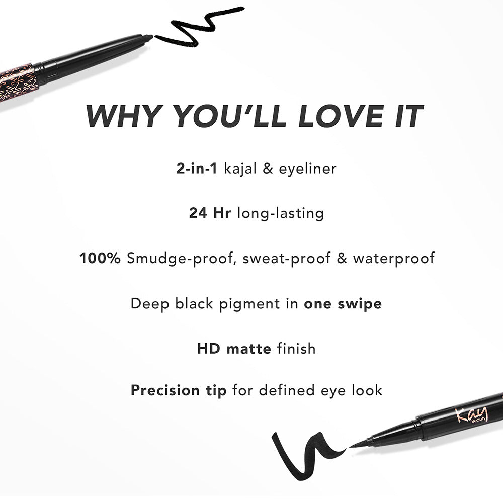 "Kay Beauty Intense Black 24H Kajal Eyeliner Duo is here to redefine your eye makeup routine. It delivers bold intensity with its kajal and unmatched precision that lasts all day long with its eyeliner.