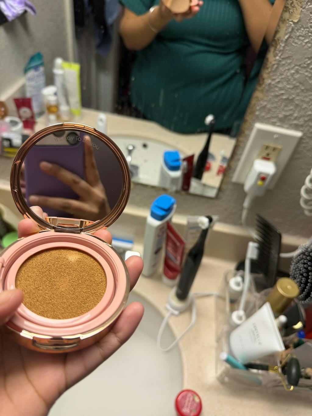 The foundation comes in a pretty case. The coverage was good and light on skin. No cakey residue. The shade selected was perfect for medium skin tone. I love it. Kay Beauty is here to conquer.