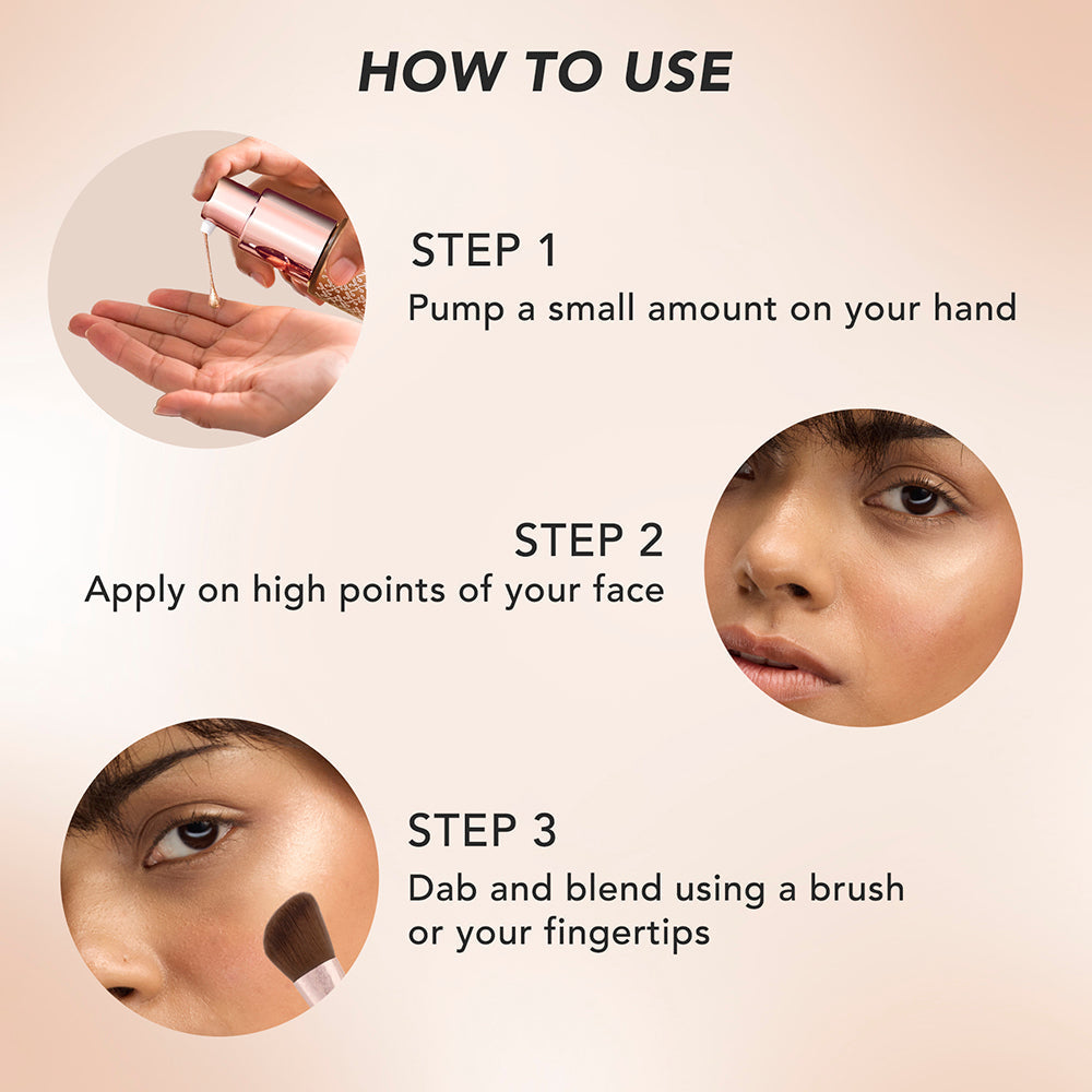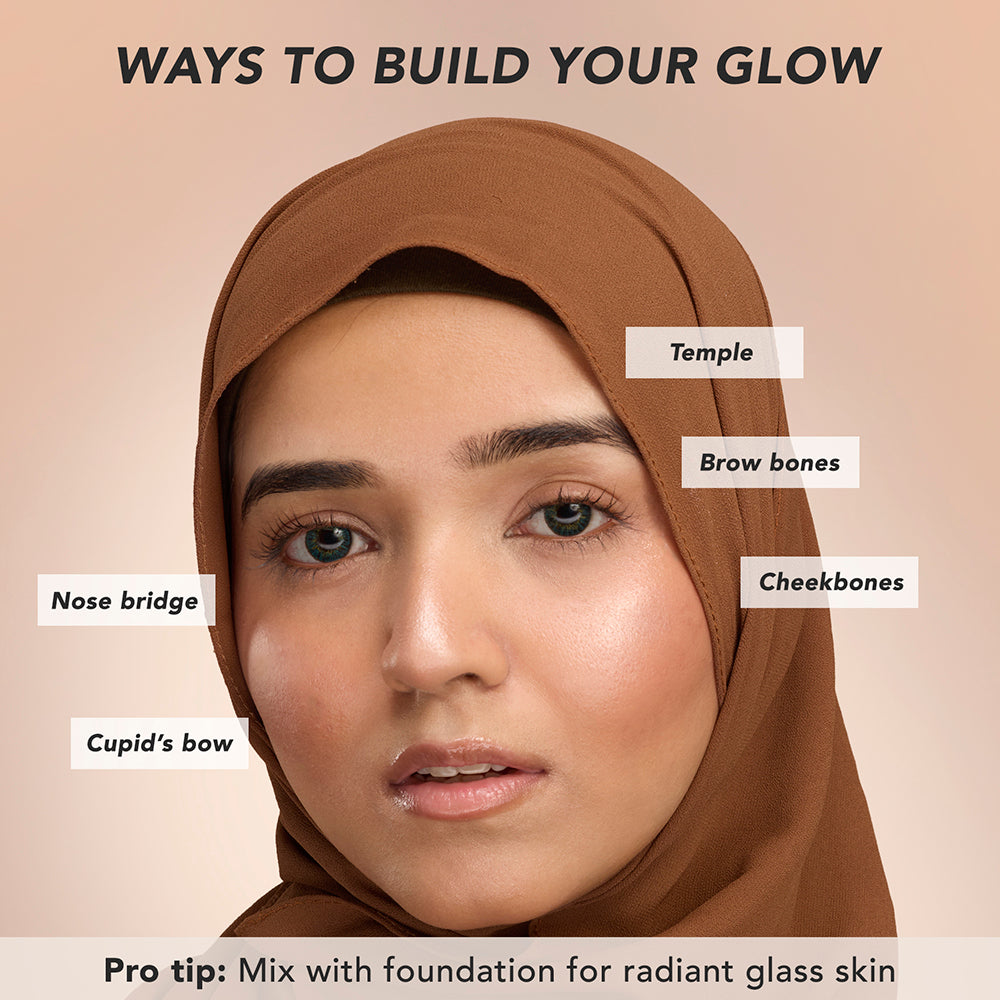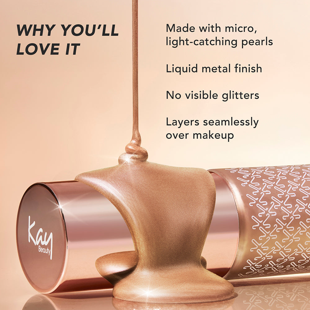 Kay Beauty Hyper Gloss Liquid Highlighter, a high-performance creamy formula that glides on like silk and melts into your skin upon dabbing. Available in three shades - Champagne, Sparkling & Rose, it is infused with Carrot Oil which sets a base of hydration under all that luminosity. Made with micro, light catching pearls, this highly pigmented highlighter gives you a multi-dimensional sheen and delivers a dewy pearlescent finish.